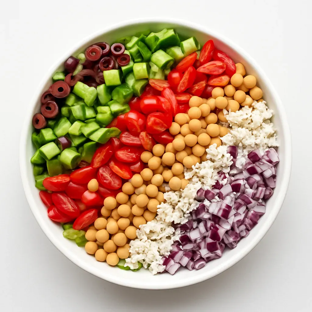A vibrant layered salad featuring fresh ingredients with a zesty homemade dressing, perfect as a side dish or light main course.