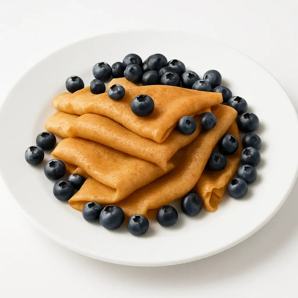 A delightful recipe for sourdough crepes, perfect for breakfast or dessert, featuring fresh blueberries and maple syrup for a sweet touch.
