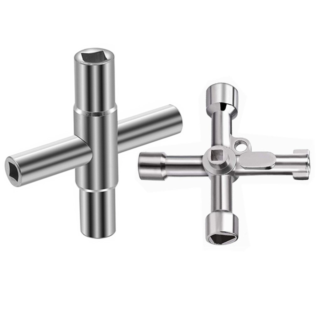 The 4-way key wrench is constructed from rust-proof and durable 40Cr steel and is designed in a crossing shape to fit valves of 1/4”, 9/32”, 5/16”, and 11/32”. The 6-way utilities key is made of steel galvanized alloy and features square, triangle, and round shapes, it can be used for various valves including electric, water, gas, train, cabinet and elevator valves.