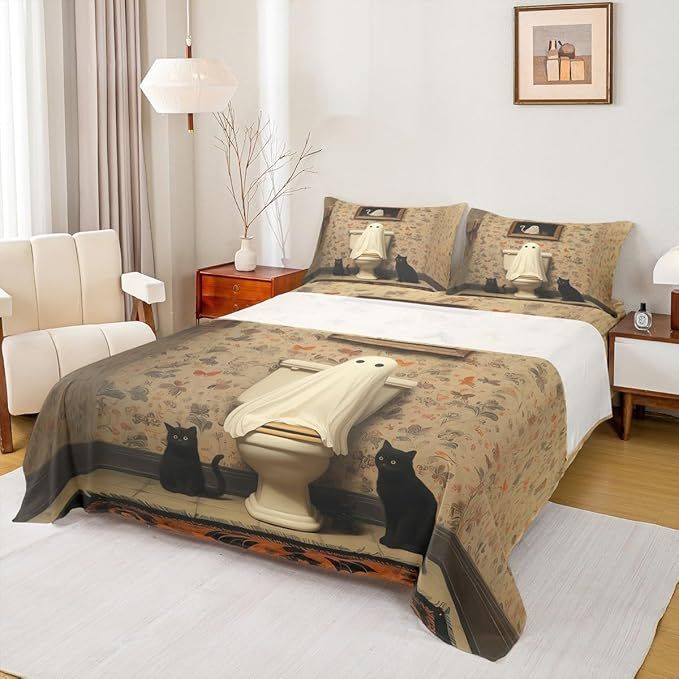 Halloween Cat Bathtub Bed Sheet Queen Size,European Vintage Design Sheets,Kawaii Ghost Bedding Sets (1 Fitted,1 Flat,2 Pillowcases) Luxury Deep Pocket Bed Sheets