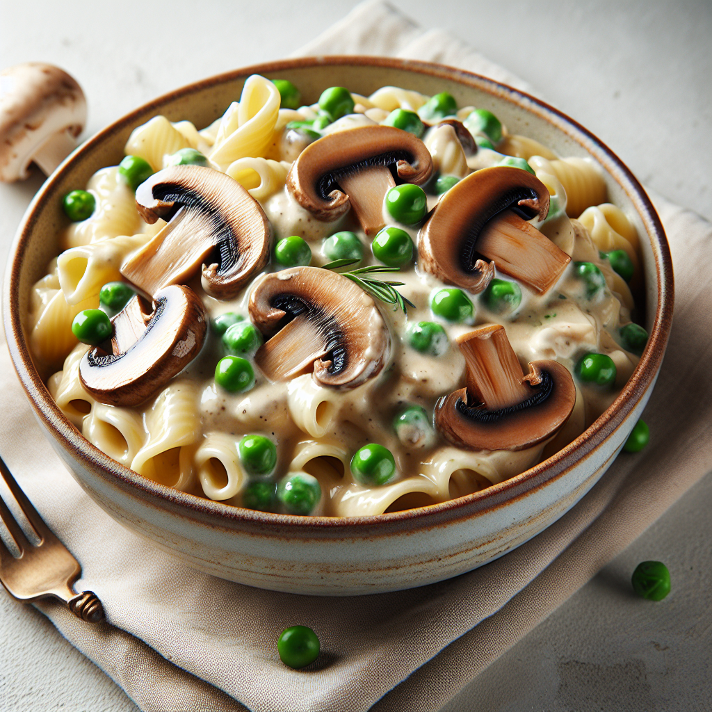 Creamy Pasta with Mushrooms and Peas is a rich and comforting vegetarian pasta dish featuring a creamy sauce, savory mushrooms, and sweet green peas. The dish begins with sautéed aromatic garlic and onions, to which sliced mushrooms are added and cooked until browned. Sweet peas are then stirred in along with cooked pasta of choice, followed by a luxurious sauce made from heavy cream, Parmesan cheese, and a pinch of nutmeg for depth. The sauce thickens as it simmers, coating the pasta evenly. This dish is an easy-to-make yet delectable that can be enjoyed as a quick weeknight dinner or a satisfying lunch. Description by ChatGPT.