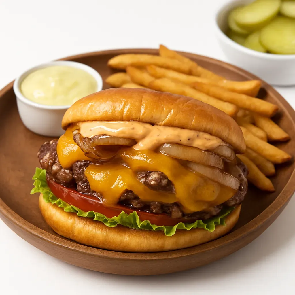 Experience the irresistible flavors of a classic diner favorite with this smash burger, featuring juicy ground beef, fresh toppings, and a tangy homemade burger sauce that surpasses traditional burgers in taste and texture.
