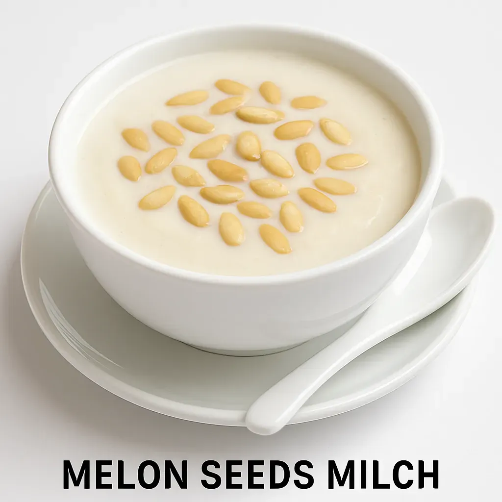 A refreshing plant-based milky drink made from blended melon seeds, perfect for a light indulgence.