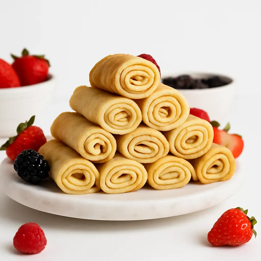 Versatile and delightful crepes that can be served as a dessert or for breakfast/brunch, topped with fresh fruits and jam for a delicious treat.