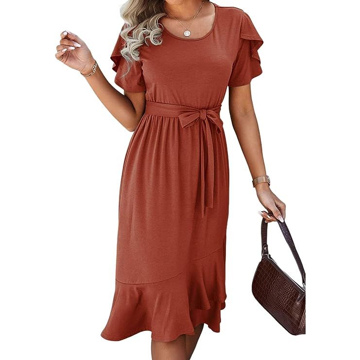 This dress features a crewneck design, adding an elegant and fashionable feel. The waist belt design accentuates your figure, while the A-line hem and pleated details add vitality to the dress. Whether you're going for a casual daily look, beach vacation attire, or dressing up for parties and outdoor activities, this dress is suitable for various occasions.