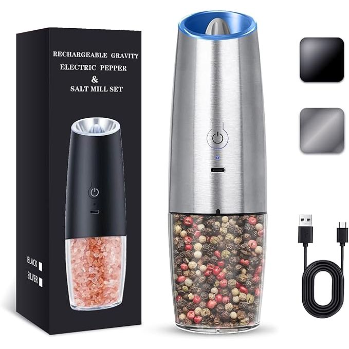 Rechargeable Electric Salt and Pepper Grinder set of 2, gravity electric salt and pepper grinder set, Adjustable Roughness, LED Light, 1 Pack, (Silver)
