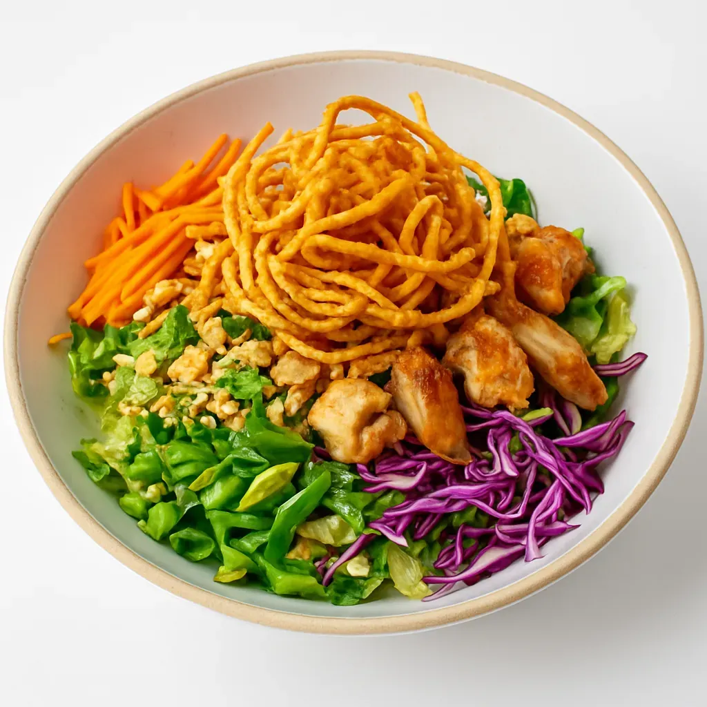 A refreshing, plant-based salad featuring crispy noodles, fresh vegetables, and a tangy dressing, perfect for a healthy and satisfying meal.